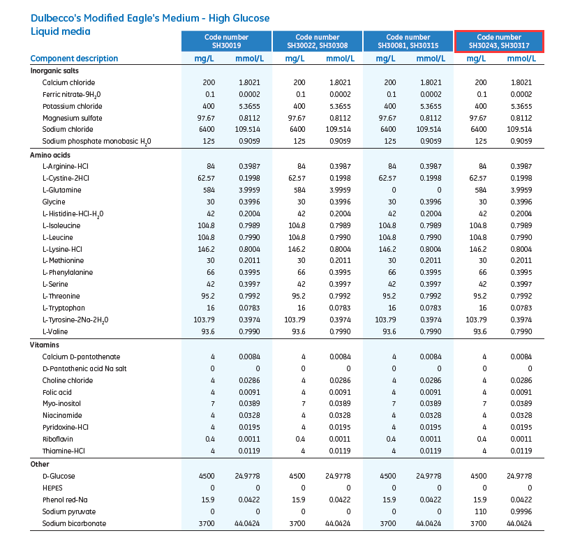 • HyClone DMEM 原材料的成分均通过了严格的质量控制测试筛选,以确保批次间的一致性。DMEM 液体培养基产品已使用纯化水进行了水化,并经过了无菌过滤。